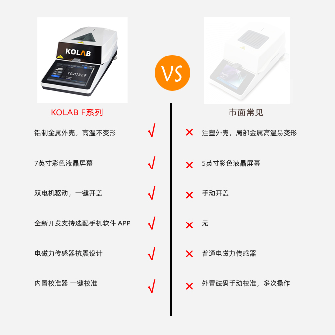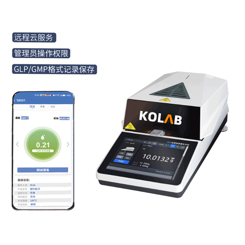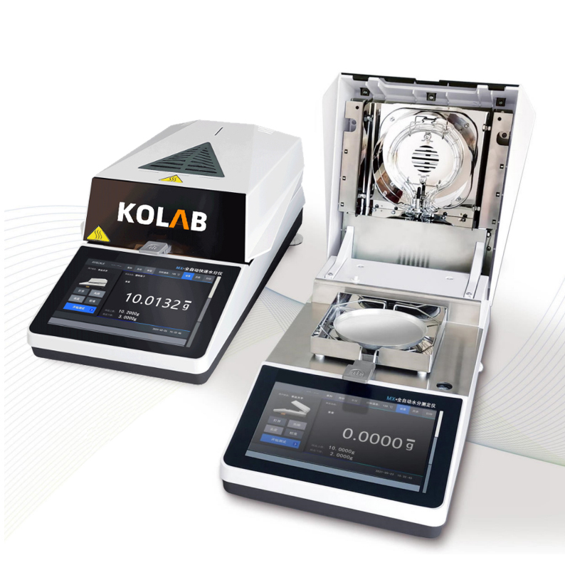 KOLAB 品牌 F系列水分儀采用抗震傳感器,稱重精度最高可達萬分之一,水分儀抗高溫設計采用全金屬合金機身,雙電機電動開蓋,無需手動操作。